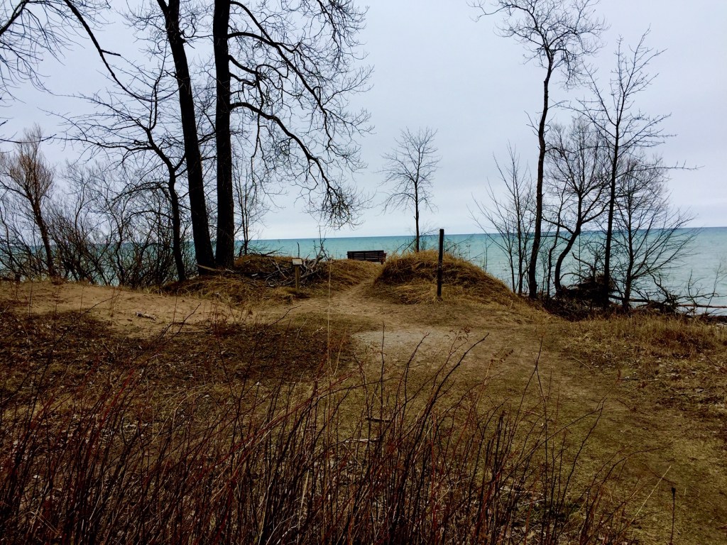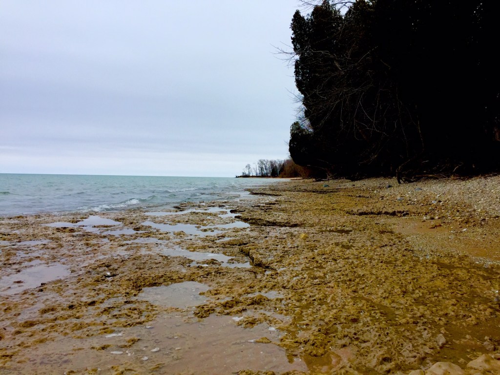 At the south end of the beach I walked out on the point that divides the human beach to the dog beach. Unfortunately for our canine friends, the dog beach has been swallowed up by the rising lake waters. However, the point offered a stunning view of the shoreline on either side and I learned from a plaque that where I was standing was once a railroad pier where stone from the nearby quarry was loaded on to ships. From google maps you can still see parts of the structure below the waters surface. I also noticed that this abutment is slowly finding its way back to the sea. It was a little scary standing on the edge.