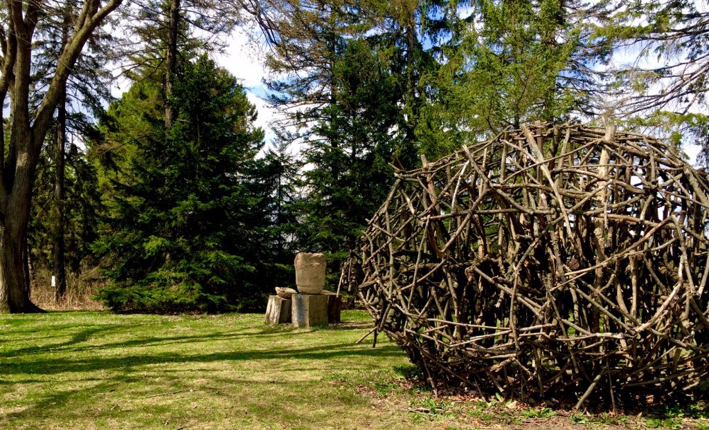 As you follow the tree line past the lake you’ll come to a fascinating sculpture set in a stand of pine trees. It seems the surroundings were made for the sculpture more than the sculpture made for the surroundings.