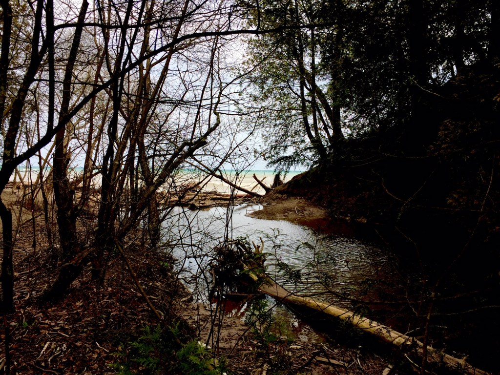 However, on a calm day you will be able to walk out a little on to the beach to the north and out in to the water. This will give you a great look at the height of the bluffs that you just climbed down. Turn to look into the gorge and you can feel how it would be an excellent place to hide if you were a king or queen of cats.