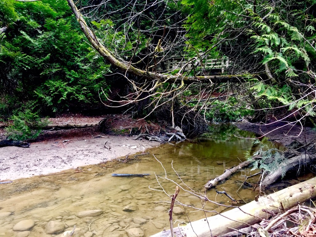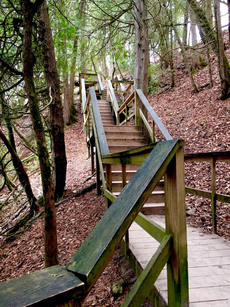 Getting back on the gravel trails, head north, zigzagging across the park if you are wanting a longer hike. On the northern most side of the park there is built a 100 plus stairway down to the waters edge. It is a long, scenic, fascinating climb down through the ravine.