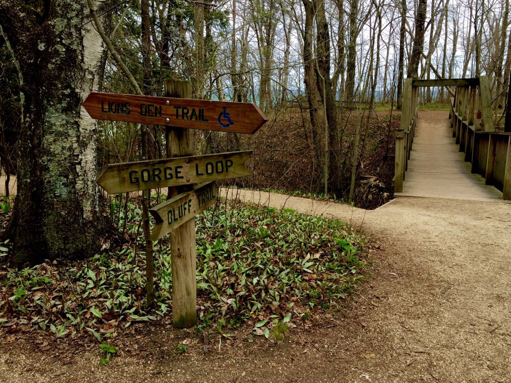 Lion’s den Gorge county park holds 1.5 miles of gravel and boarded hiking trails running throughout the park. Parts of the trails are handicap accessible and some run along the edge of the bluff while others meander through old growth forest and wetlands.